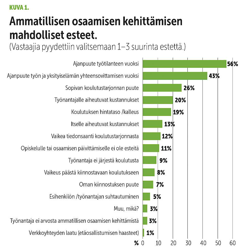Hieman yli puolet vastaajista koki suurimmaksi ammatillisen kehittymisen esteeksi ajan puutteen työtilanteen vuoksi (kuva 1). Myös ajan puutteen työn ja yksityiselämän yhteensovittamisessa koettiin olevan merkittävä kehittymisen este. Etenkin vakinaisessa työsuhteessa työskentelevät kokivat ajanpuutetta työtilanteen vuoksi. Määräaikaisessa työsuhteessa työskentelevät kokivat enemmän ajanpuutetta työn ja yksityiselämän yhteensovittamisessa. Kunta- ja valtiosektorilla työskentelevät kertoivat muita useammin esteen syyksi työnantajalle aiheutuvat kustannukset. Vastaajat mainitsivat avoimessa vastauskentässä oman osaamisen kehittämisen esteeksi hyvin usein henkilökohtaisten resurssien puutteen (aika, energia tai motivaatio ei riitä). Työtehtävistä tai työnantajasta johtuvat syyt mainitaan myös usein.