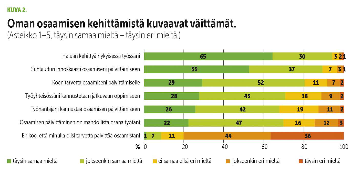 Valtaosa (89 %) kyselyyn vastanneista on kehittänyt osaamistaan viimeisen viiden vuoden aikana. Merkitsevää eroa osaamisen kehittämisen suhteen ei ollut vakituisessa työsuhteessa tai määräaikaisessa työsuhteessa työskentelevien välillä. Kuntasektorilla, suuryrityksissä ja yliopistolla työskentelevistä osaamistaan oli kehittänyt yli 90 %:a vastaajista, kun mikroyrityksissä ja järjestöissä työskentelevistä osaamistaan olivat kehittäneet 83 %:a vastaajista. Suurin osa vastaajista (78 %) oli kehittänyt osaamistaan omaan työhön liittyvässä työnantajan maksamassa tai järjestämässä koulutuksessa. Mikroyrityksissä (alle 10 työntekijää) työskentelevät kehittivät osaamistaan omakustanteisissa omaan työhön liittyvissä koulutuksissa selvästi muita useammin.