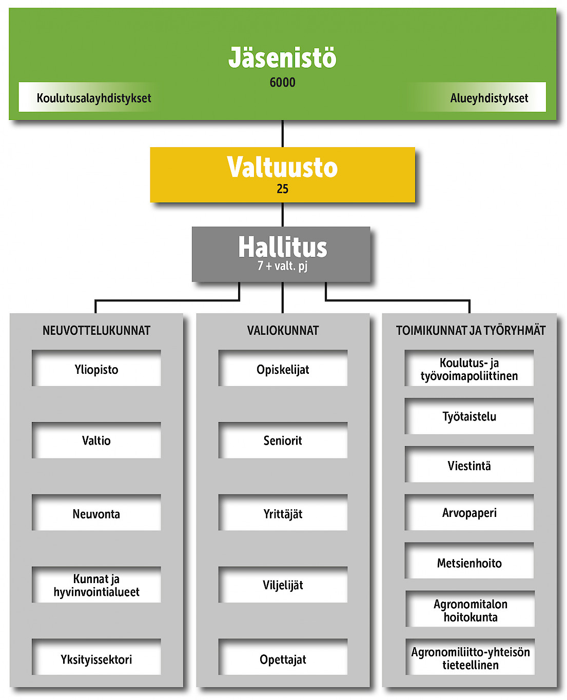 Agronomiliittoon kuuluu noin 6000 jäsentä suorina henkilöjäseninä. Liittoon kuuluu myös 24 jäsenyhdistystä, jotka jakautuvat koulutusaloittain sekä alueellisesti. Agronomiliiton ylin hallintoelin on 25-jäseninen valtuusto, joka nimeää 7-henkisen hallituksen. Toimistolla työskentelee seitsemän henkilöä, liitolla on neljä opiskelijapromoottoria ja edunvalvontatyössä toimivat liiton jäsenistä kootut eri sektoreiden neuvottelu- ja toimikunnat sekä valiokunnat. Agronomiliitto tekee aktiivisesti yhteistyötä Akavassa sekä sen neuvottelujärjestöissä Jukossa ja YTN Ylemmät toimihenkilöt ry:ssä.