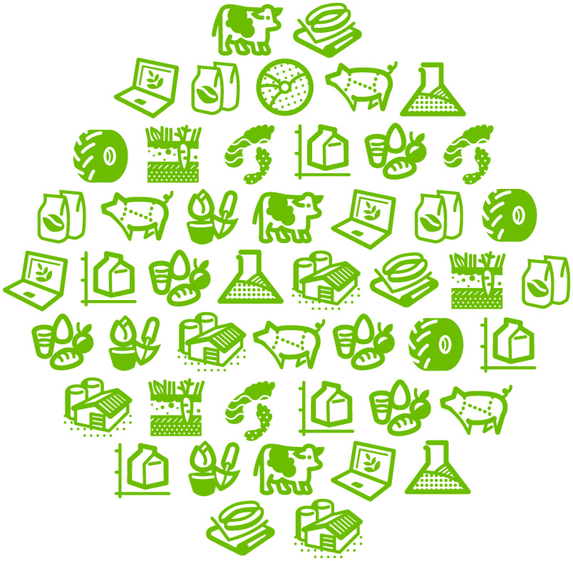 Leipää, lannoitteita, kauppaa, tutkimusta, markkinointia, koneita, myyntiä, kasveja, energiaa, mikrobeja, maaperää, traktoreita, tölkkejä, tietokoneita, siemeniä, makkaraa, hiilijalanjälkeä ja lautasmalli. Teetimme viime vuonna symboleita kuvaamaan jäsenkunnan kirjoa.