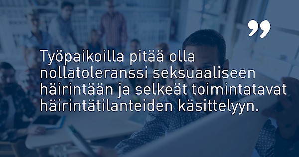 - Selvästi koetaan, ettei häirintää kannata ottaa puheeksi. Seksuaalisen häirinnän ehkäisemisessä ja siihen puuttumisessa keskeisin vastuu onkin työpaikkatasolla. Työpaikoilla pitää ottaa ehdoton nollatoleranssi seksuaaliseen häirintään ja rakentaa selkeät toimintatavat häirintätilanteiden käsittelyyn, sanoo liittojen tutkimusyhteistyötä koordinoinut erityisasiantuntija Piritta Jokelainen Yhteiskunta-alan korkeakoulutetuista.