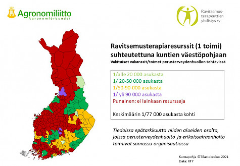 Vähäisetkään ravitsemusterapiapalvelut eivät ole kaikkien saatavilla. Noin 2 miljoonaa suomalaista asuu kunnissa, joiden perusterveydenhuollossa ei ole lainkaan ravitsemusterapeuttien vakansseja. Näin pienet ja alueellisesti epätasa-arvoiset resurssit eivät mahdollista ravitsemushoidon osalta sote-uudistuksen keskeistä tavoitetta turvata yhdenvertaiset ja laadukkaat sosiaali- ja terveydenhuollon palvelut kaikille hyvinvointialueella asuville. Tavoitteiden saavuttamiseksi ravitsemusterapiaresurssien tulisi olla moninkertaiset nykyiseen verrattuna.