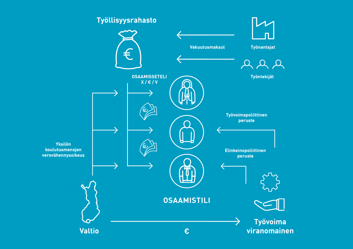 Setelin lisäksi myös työvoimaviranomainen voisi ohjata varoja osaamistilille. Perusteena olisi joko yksilön koulutustarve tai tarve vastata jonkin alueen tai toimialan osaamistarpeisiin. Mallia täydentäisi yksilön oikeus vähentää koulutuskuluja verotuksessa.