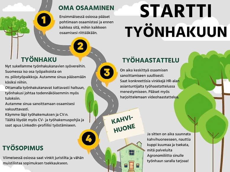 Olemme keränneet Startti työnhakuun -verkkokurssille uravalmentajien avustuksella parhaat vinkit työnhakusi tueksi. Käsittelemme kurssilla oman osaamisen tunnistamista, työnhaun kanavia, työnhakuasiakirjoja, työhaastattelua ja työsopimusta. Voit suorittaa kurssia itsenäisesti, omassa tahdissa. Arviomme mukaan kurssin läpikäynti vie noin 2 tuntia. Voit aina palata materiaaleihin oman aikataulusi ja tarpeesi mukaan.