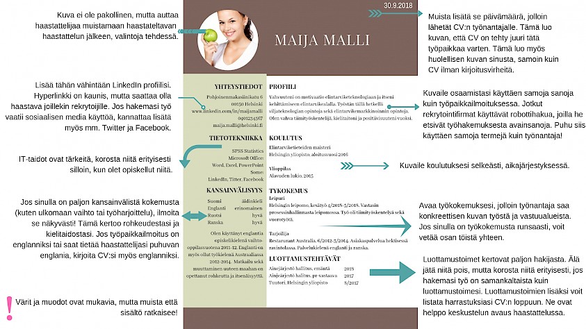 Tässä kirjoituksessa avataan malli CV:n avulla ansioluettelon kirjoittamisen saloja. Voit käyttää malli CV:tä apuna, kunhan muistat tehdä omasta CV:stäsi sinun näköisesi.