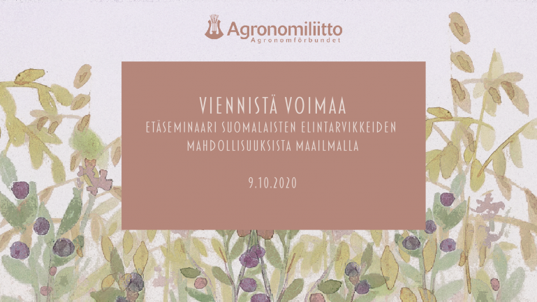Agronomiliiton opiskelijavaliokunnan opiskelijajäsentapahtuma järjestetään etäseminaarina 9.10.2020. klo 18-20. Tilaisuus on maksuton Agronomiliiton opiskelijajäsenille.