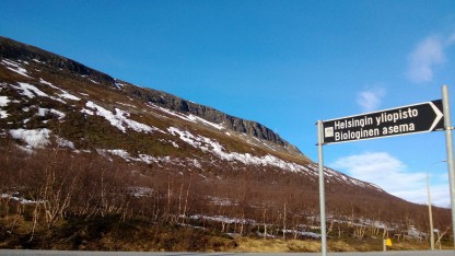 Kevätlukuvuosi oli kiireinen. Vasta toukokuussa muistin stipendin umpeutuvan 30.6. ja aloin järjestää reissua Kilpisjärvelle. Otin yhteyttä tutkimusaseman yhteyshenkilöön ja sain majoituksen kesäkuun ensimmäiselle viikolle. Aluksi ajattelin ajavani autolla Suonenjoelta, mutta yli 900 km ja 14 tunnin ajomatka ei houkutellut. Matkustustavaksi valikoitui juna ja bussi, pitkästä välimatkasta johtuen matkaan piti varata vuorokausi. Kahdeksan tuntia reissasin kolmella junalla Suonenjoki-Kajaani-Oulu-Rovaniemi, yön majoituin guesthouse Borealiksessa Rovaniemellä ja seuraavana päivänä vietin kuusi tuntia bussissa Rovaniemi-Kilpisjärvi -välillä. Bussin päätepysäkki oli Norjassa, joten nukkuminen ei käynyt mielessä enää loppumatkasta. Bussin ikkunasta näkyi vähän väliä poroja, jotka eivät millään meinanneet siirtyä pois tieltä. Käsivartta kohti mentäessä maisema muuttui karuksi erämaaksi, taustana tunturit ja ainoina puina pienet tunturikoivut.