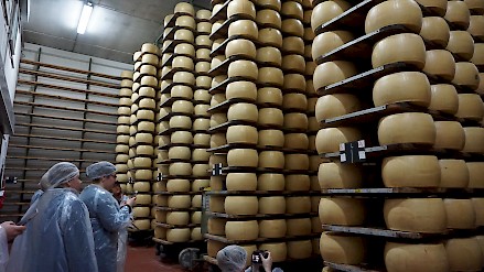 Vierailemamme parmesaanijuustola oli tuotannoltaan melko suuri, ja joka päivä juustoa valmistettiin useita satoja kiloja. Työt alkavat juustolassa aikaisin aamulla, kun maito tulee maitotilalta juustolaan. Iltamaito säilötään laakeissa astioissa, joissa maidon pinta kermoittuu ja maidon annetaan ”levätä”. Aamumaito sekoitetaan iltamaitoon, minkä jälkeen maito juoksutetaan. Juoksutusta seuraa maidon lämmitysprosessi, jonka jälkeen juuston annetaan levätä kuumassa herassa. Juuston ylös nostaminen on pelkkää käsityötä. Tuoreet juustot painavat lähemmäs 50 kiloa, joten hyvästä kunnosta juustolatyöntekijälle on hyötyä! Juustot ovat muoteissa muutaman päivän, jota seuraa kahden viikon suolakylpy. Lopulta juustot päätyvät kellariin kypsymään jopa kolmeksi-neljäksi vuodeksi odottamaan parmesaanin ainutlaatuisen maun muodostumista. Parmesaanin valmistus on pitkälti käsityötä edelleen, ja perinteiden noudattaminen on hyvin tärkeää.
