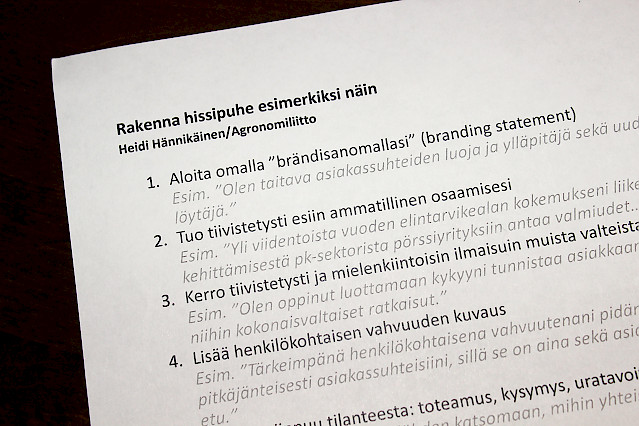 Lounastauon jälkeen iltapäivällä ensimmäisenä ohjelmassa oli Heidi Hännikäisen ohjaama hissipuhetyöpaja. Tunnin työpajassa ehdittiin kaikille osallistujille luoda alustava hissipuhe ja myös harjoitella puhetta parityöskentelynä.