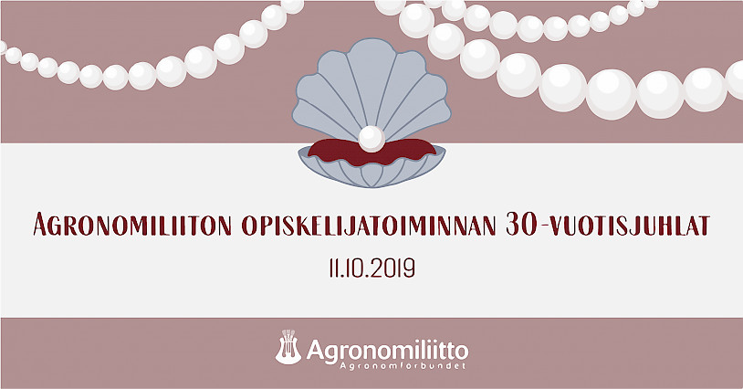 On kulunut 30 vuotta siitä, kun Agronomiliiton opiskelijatoiminta pyörähti käyntiin. Matkan varrelle on mahtunut monenlaista tapahtumaa ja nyt on aika juhlia. Haluamme kutsua juuri sinut juhlistamaan tätä rajapyykkiä ja opiskelijatoiminnan helmihääpäivää perjantaina 11.10.2019 klo 18.00. Juhlatilaisuus pidetään Agronomitalossa liiton tiloissa, osoitteessa Pohjoinen Makasiinikatu 6 A 8, Helsinki.