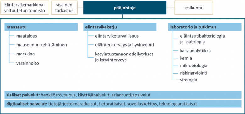 Ruokaviraston henkilöstö jakautuu linjoihin vastuualueiden mukaan maaseudun, elintarvikeketjun sekä laboratorion ja tutkimuksen alle. Linjojen ohella viraston asiantuntijoita työskentelee sisäisten palvelujen toimintakokonaisuudessa ja digitaalisten palvelujen toimintakokonaisuudessa.