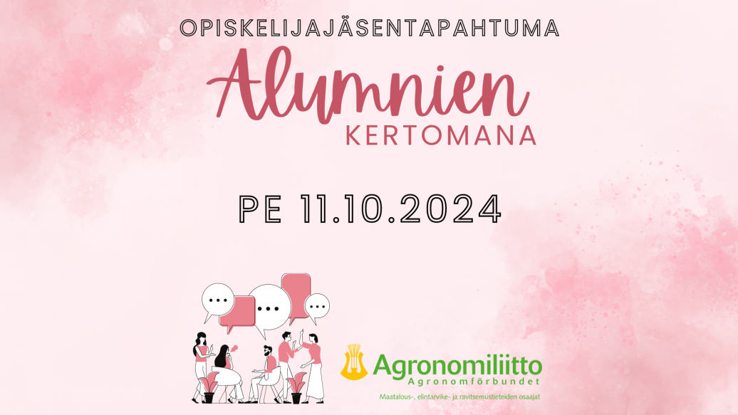 Agronomiliiton opiskelijajäsentapahtuma on täällä taas! Vuoden teemaksi on valikoitunut verkostoituminen alojemme alumnien kanssa. Illan aikana pääset nauttimaan illallista alumniemme seurassa.