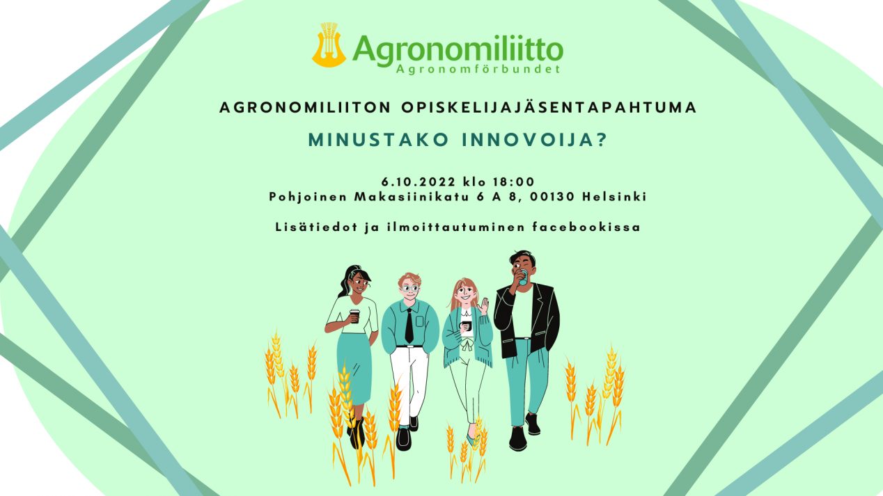 6.10.2022 18:00 Agronomiliiton opiskelijajäsentapahtuma on täällä taas! Tänä vuonna illan teemana on innovaatiot.